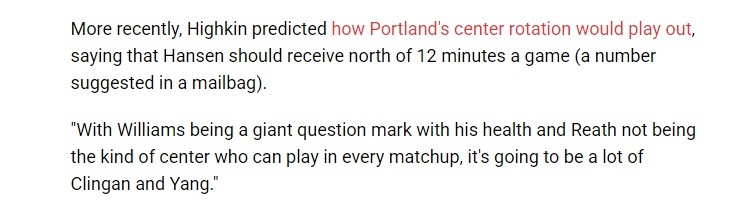 Highkin表示杨瀚森下赛季每场比赛可能获得超过12分钟的上场时间,他说:“由于罗威的健康状况存在很大不确定性,而里斯又不是那种能胜任所有对位的中锋,因此克林根和杨将承担大部分任务。”